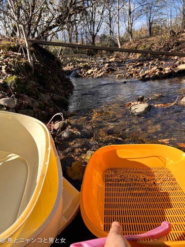 沢の水も冷たくなった。 汚れたニャンとも清潔トイレをジャブジャブ洗う。 指が痺れる。汚れはすべて天然成分のモノなので自然に還るやろ。 ···